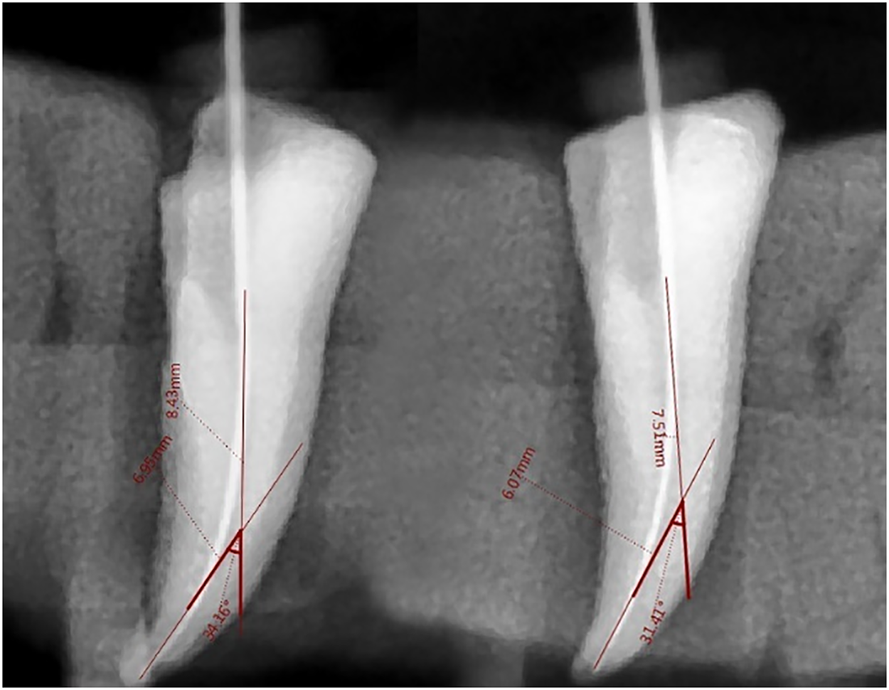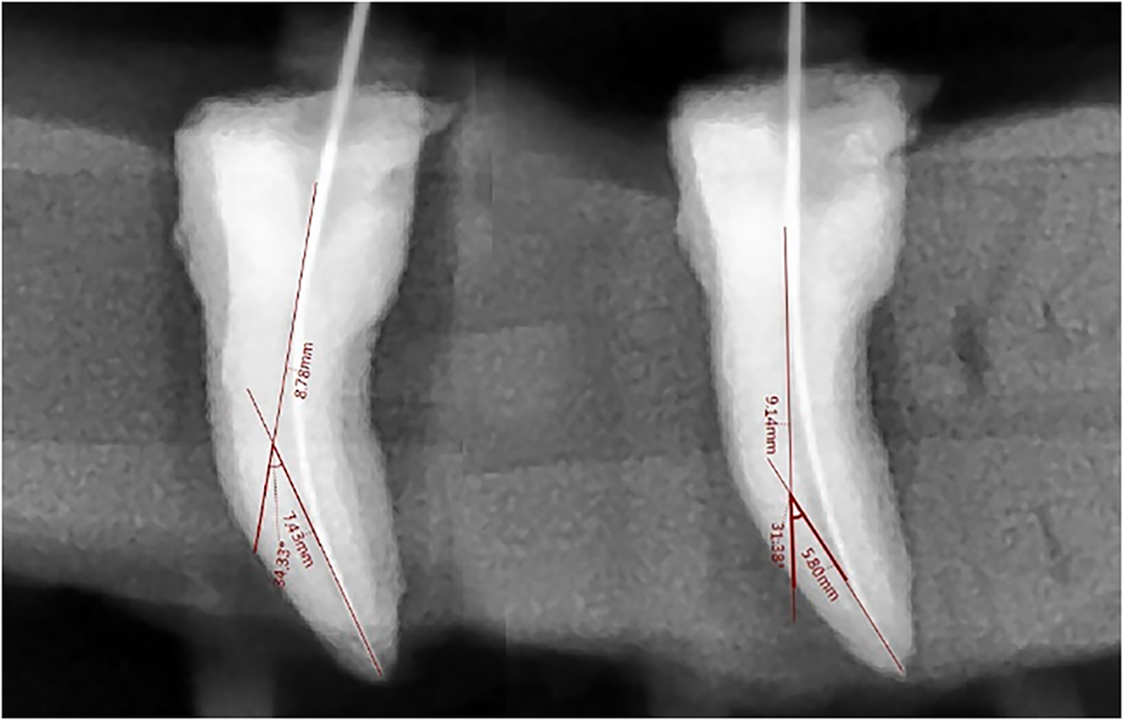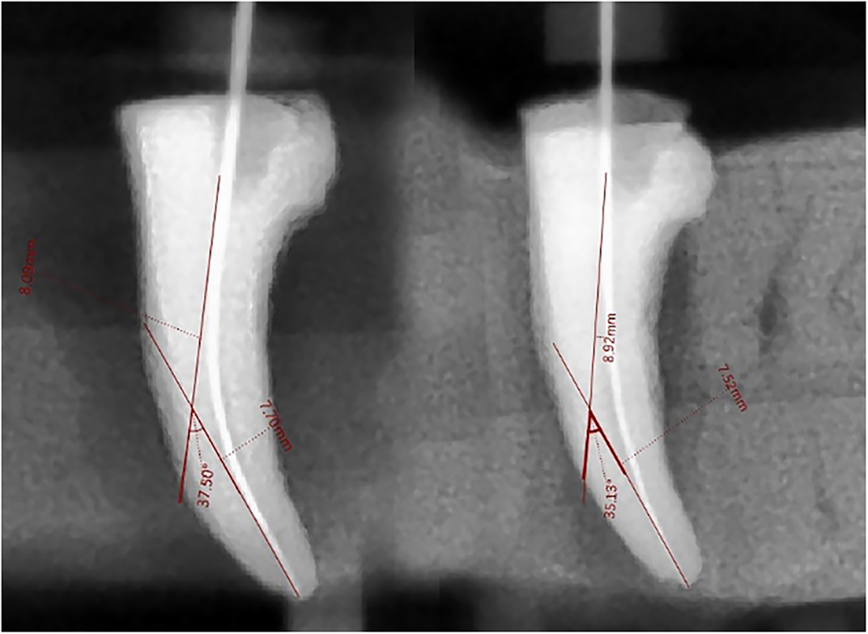Lastly, sterile paper tips were used to dry the canals. Only the researcher prepared each channel. The following instrumentation, the same circumstances as for initials were used for the specimens to take radiographs using digital dental periapical imaging (Figs. 1–3). The identical method as previously described was used to take the post-operative photos. The same procedure was used to measure the specimens’ canal curvatures. The initial measurement was of the post-instrument canal curvature.