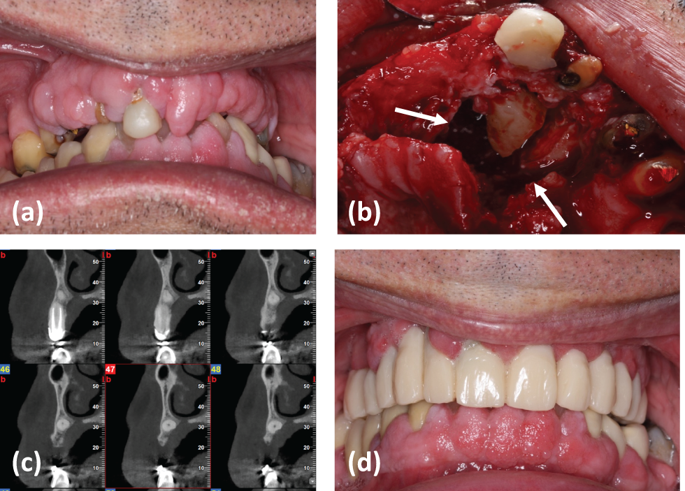 Fig. 1. (a) Baseline picture, (b) Surgical treatment of gingival hyperplasia combined with extraction of part of the impacted tooth. The arrows indicate the bone needed to be removed in order to extract part of the impacted #13, (c) CBCT reveals that the impacted tooth #13 has no periodontal ligament suggesting that the tooth is ankylosed, and (d) Reevaluation, clinical presentation of surgical treatment and placement of provisional restoration in the maxilla.