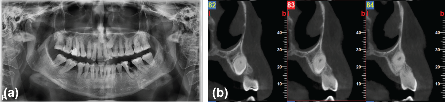 The patient was scheduled for steps 1, 2 and 3 of periodontal treatment. Step 4 was periodontal surgery, including gingivectomy and open flap debridement. At the same time, part of the ankylosed impacted tooth #13 was extracted. The apical part of the root was not extracted since the extraction would have created a severe osseous defect. During the surgery, an odontogenic cyst that was mesial to the impacted tooth was also removed, and guided bone regeneration was attempted with allograft, xenograft and collagen membrane (Fig 1b). The CBCT revealed an odontogenic cyst and an impacted canine #13. (Fig 1c). The patient tolerated treatment well and was scheduled for dental implant placement in 6 months. Unfortunately, the patient discontinued treatment due to medical reasons.