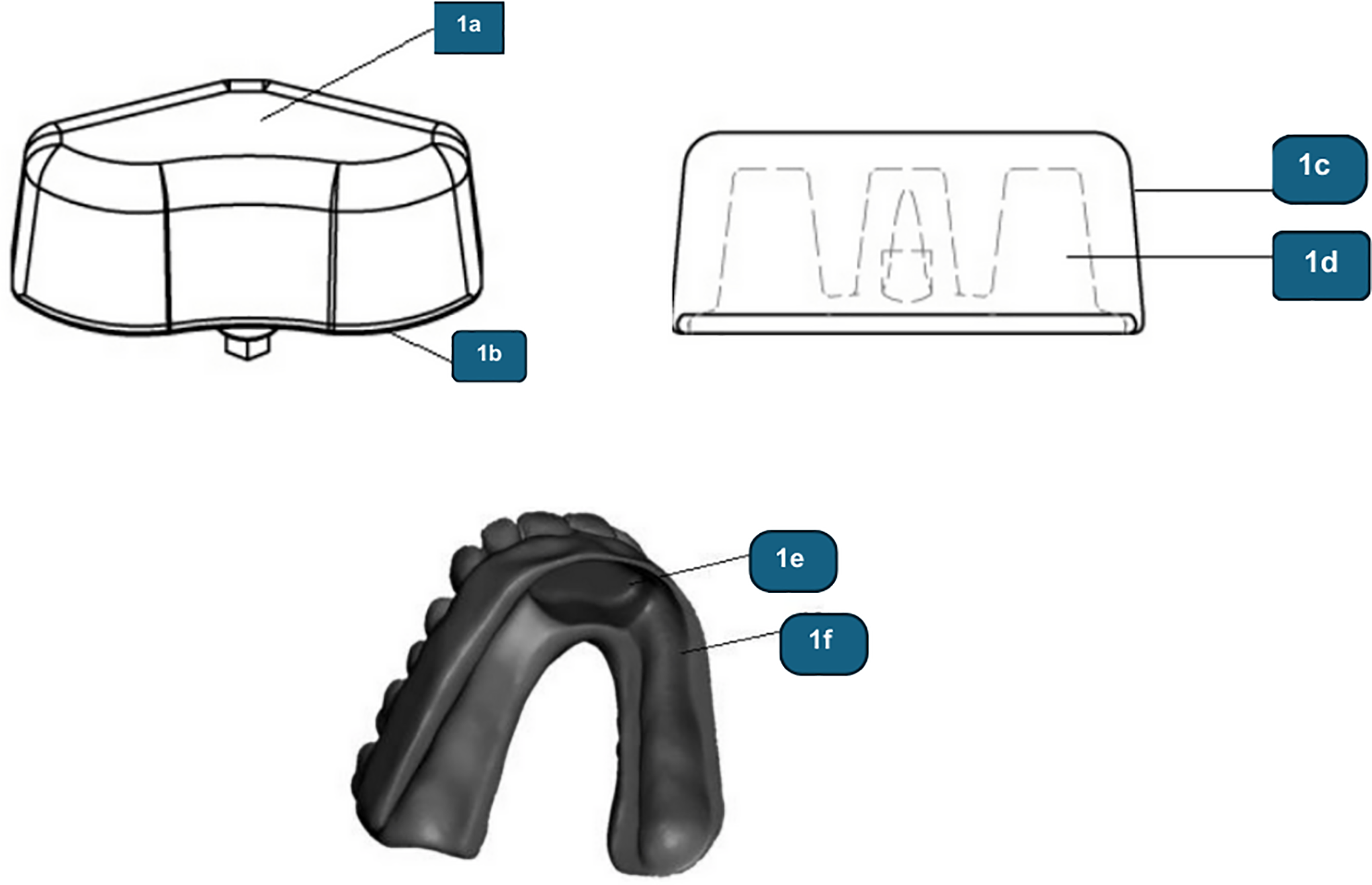 Fig. 1. T-OVER and PLUG T system. [1a = Occlusal view; 1b = TConnect connection; 1c = Lateral view; 1d = PLUG T (tripod plug); 1e = Retentive slot for pressure-fit retention system; 1f = Denture base area for overdenture adaptation].