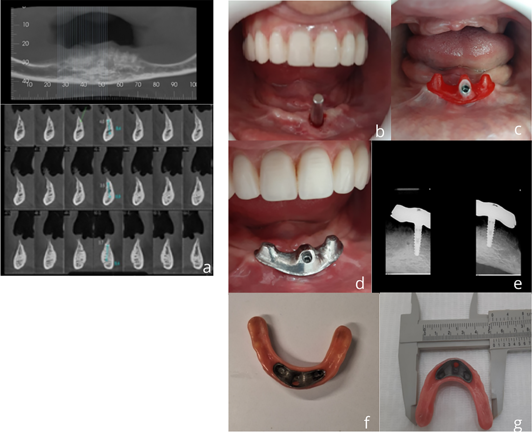 Fig. 2. Clinical study: baseline (2019)–a) Initial CBCT scan; b) buccal inclination of the implant (3.5/10 mm;internal hexagon); c) T-OVER abutment in acrylic modeling ; d) periapical radiograph with T-OVER installed; e) T-OVER cast in cobalt-chromium; f) basal view of the prosthesis; (g) overdenture base adaptation area measuring 45 mm.