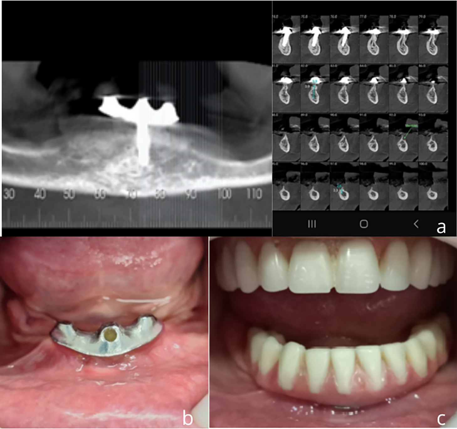 Fig. 3. Five-year follow-up (2024)–a) CBCT image at 5 years; b) clinical view of the T-OVER abutment and c) the complete mandibular overdenture.