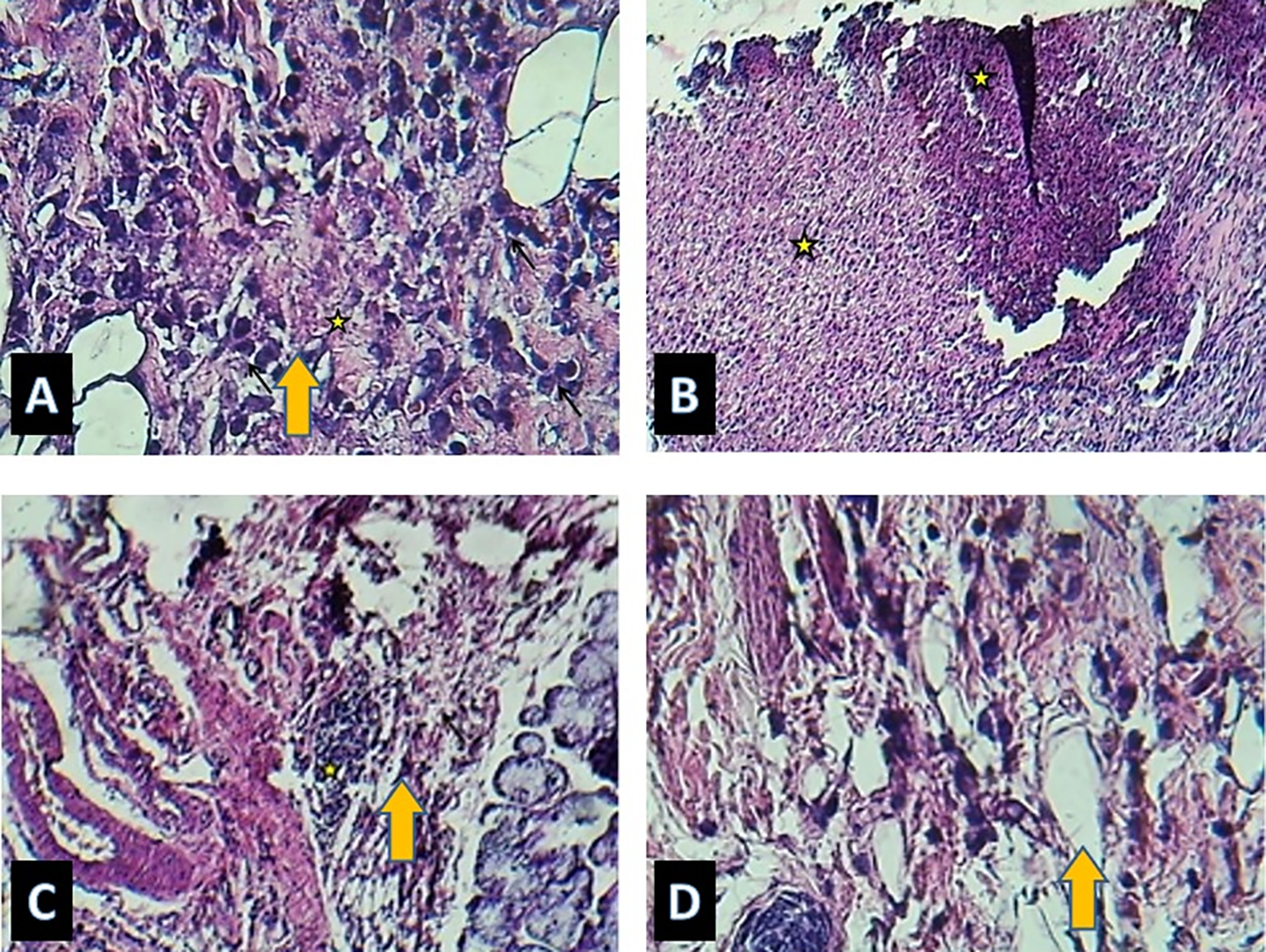 Fig. 2. Histological view of buccal mucosa on day 3. (A) Necrotic tissue (asterisks), inflammatory cells aggregation (yellow arrow), H&E 40x, (B) leukocytes infiltration (Asterisks), H&E 10x, (C) necrotic tissue (yellow arrow), H&E 10x, (D) infiltration of leukocytes (yellow arrow), H&E 40x.