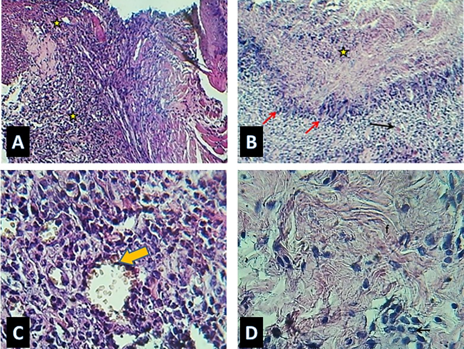 Fig. 3. Histological view of wound site on day 5. (A) Infiltration of leukocytes (asterisks), H&E 10x, (B) inflammatory zone (red arrows), and infiltration of leukocytes (black arrows), H&E 40x, (C) well angiogenesis (yellow arrow), H&E 10x, (D) fibrous tissue -f-, H&E 40x.