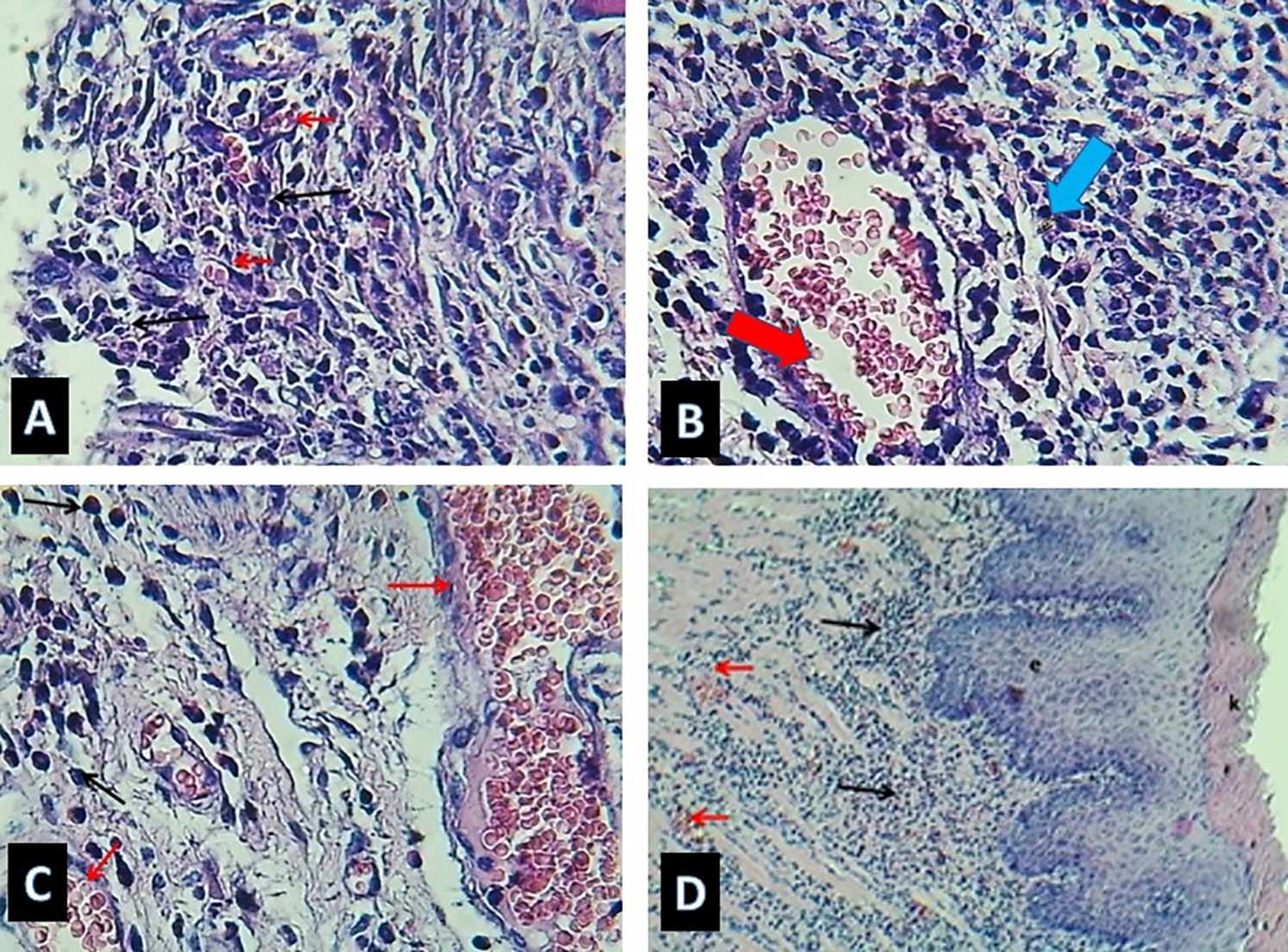 Fig. 4. Histological view of wound site on day 7, H&E 40x. (A) Infiltration of leukocytes (black arrows) mild angiogenesis (red arrows), (B) infiltration of leukocytes (blue arrow), vascular congestion (red arrow), (C) vascular congestion (red arrows) with infiltration of leukocytes (black arrows), (D) hyperkeratosis [k] acanthosis of lining cells -e-, vascular congestion (red arrows) with little infiltration of leukocytes (black arrows).