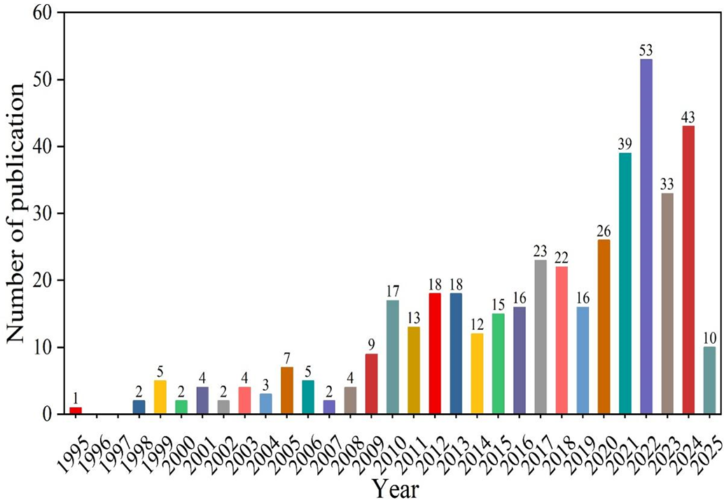 Fig. 1. Annual publication volume of oral cancer drug adverse reactions research (1995–2025).