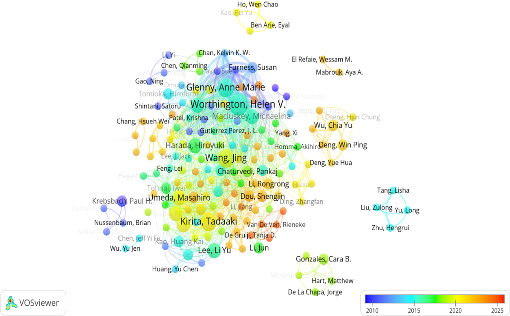 Fig. 2 and Table II presents the author collaboration network in oral cancer drug adverse reactions research, complemented by comprehensive bibliometric data in the table. Worthington, Helen V. demonstrates the highest productivity with 6 publications and an exceptional total link strength of 10,999, positioning her as the central figure in collaborative research networks across the field. Glenny, Anne Marie follows closely with 5 publications and comparable link strength (10,731), while Kirita, Tadaaki and Wang, Jing also contributed 5 publications each but with notably lower link strengths (1,325 and 897 respectively), suggesting different collaboration patterns. Interestingly, Conway, David I. and Macluskey, Michaelina exhibit identical metrics (4 publications, 9,854 link strength, 166 citations), indicating they likely collaborate closely within the same research cluster, while Chaturvedi, Pankaj, despite having only 3 publications, accumulated the highest citation count (849), revealing the substantial impact of his research despite fewer collaborative connections.