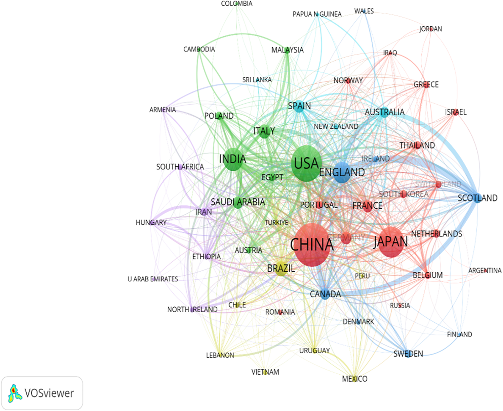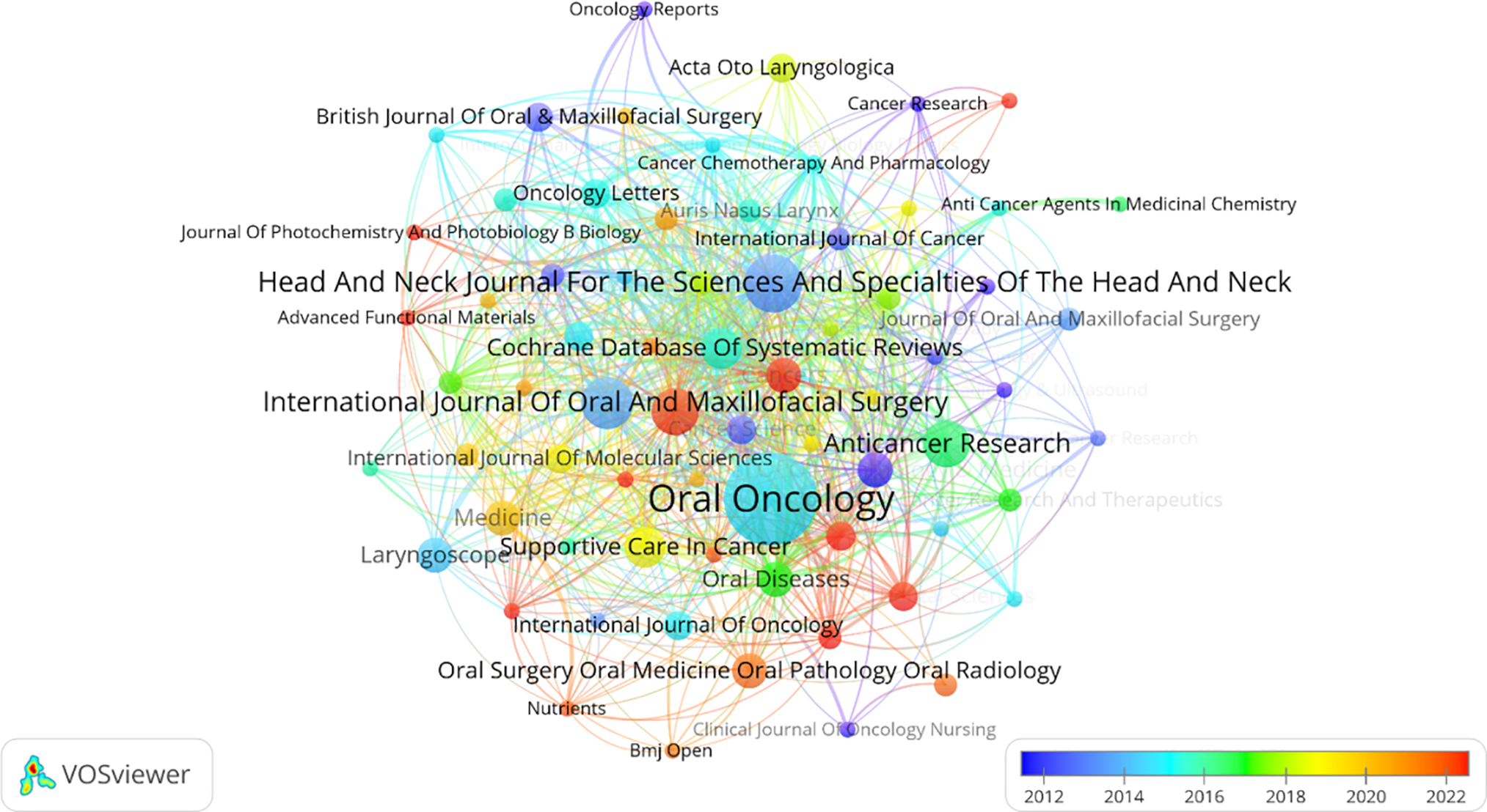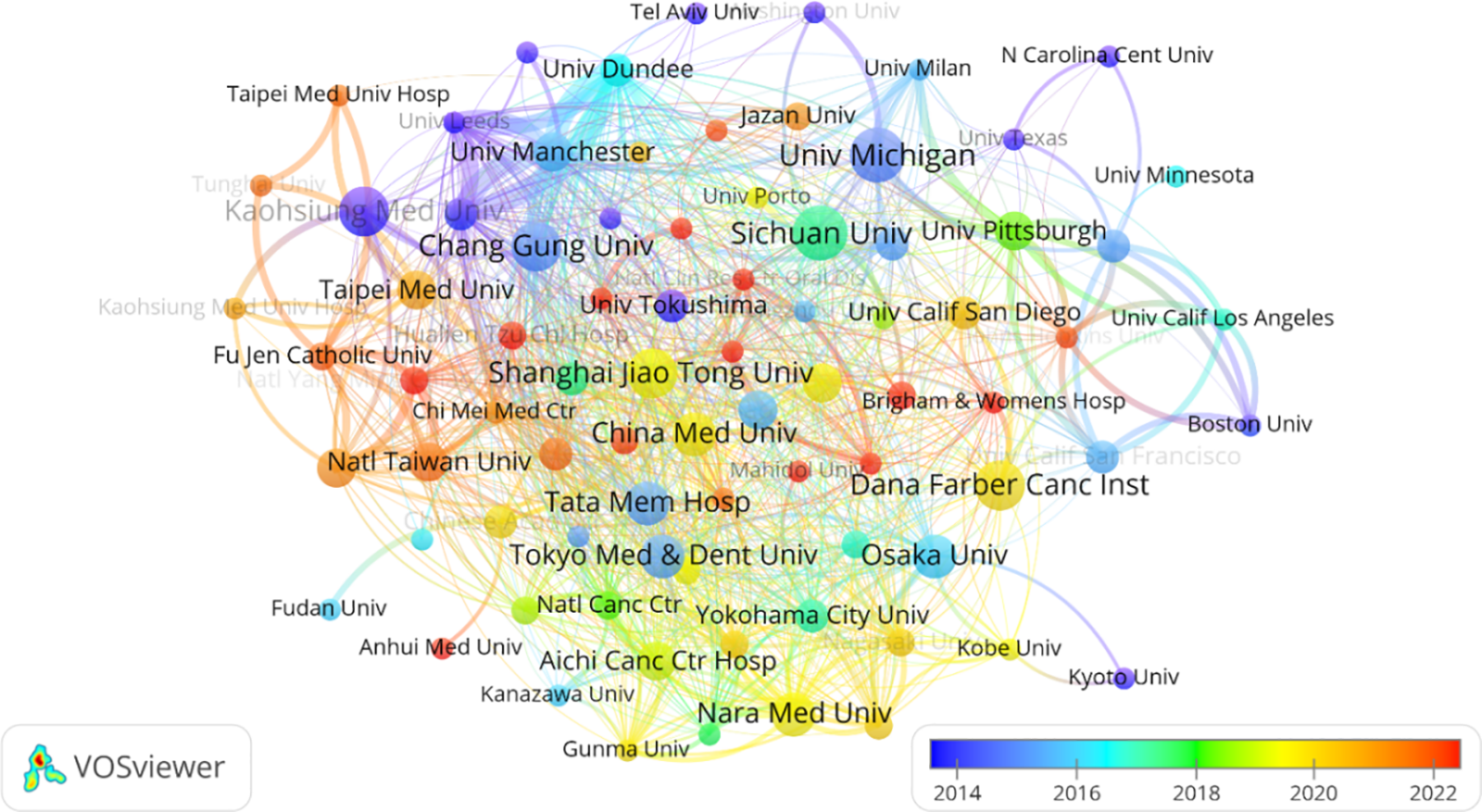Fig. 3 and Table III illustrates the institutional collaboration network in oral cancer drug adverse reactions research, with color gradients representing the temporal evolution of collaborations from 2014 (blue) to 2022 (red). The University of Michigan and Sichuan University emerge as the most productive institutions with 9 publications each, though they differ in total link strength (865 vs. 533) and citation impact (160 vs. 147), indicating different collaboration patterns and research influence. Notable research clusters can be observed around Asian institutions including Shanghai Jiao Tong University, Chang Gung University, and Tokyo Medical and Dental University, suggesting strong regional collaborative networks particularly in East Asia. Despite having fewer publications [7], Tata Memorial Hospital achieved the highest citation count (980) among all institutions, demonstrating exceptional research impact relative to publication volume. The visualization also reveals strong collaborative connections between Western institutions such as the University of Manchester, University of Glasgow, and University of Dundee (link strengths: 4464, 4051, and 4047 respectively), suggesting established multinational research partnerships in this field.