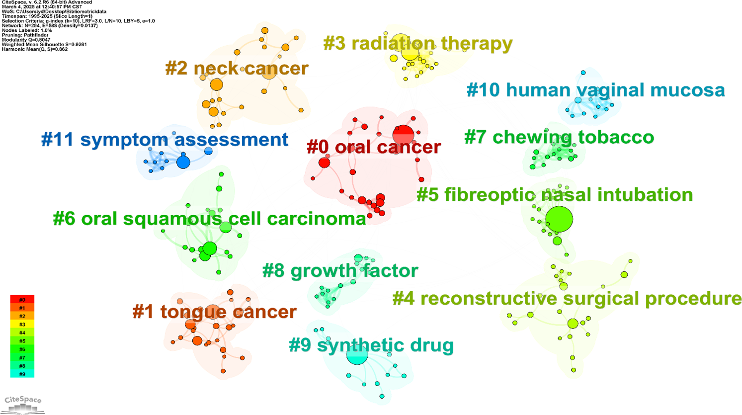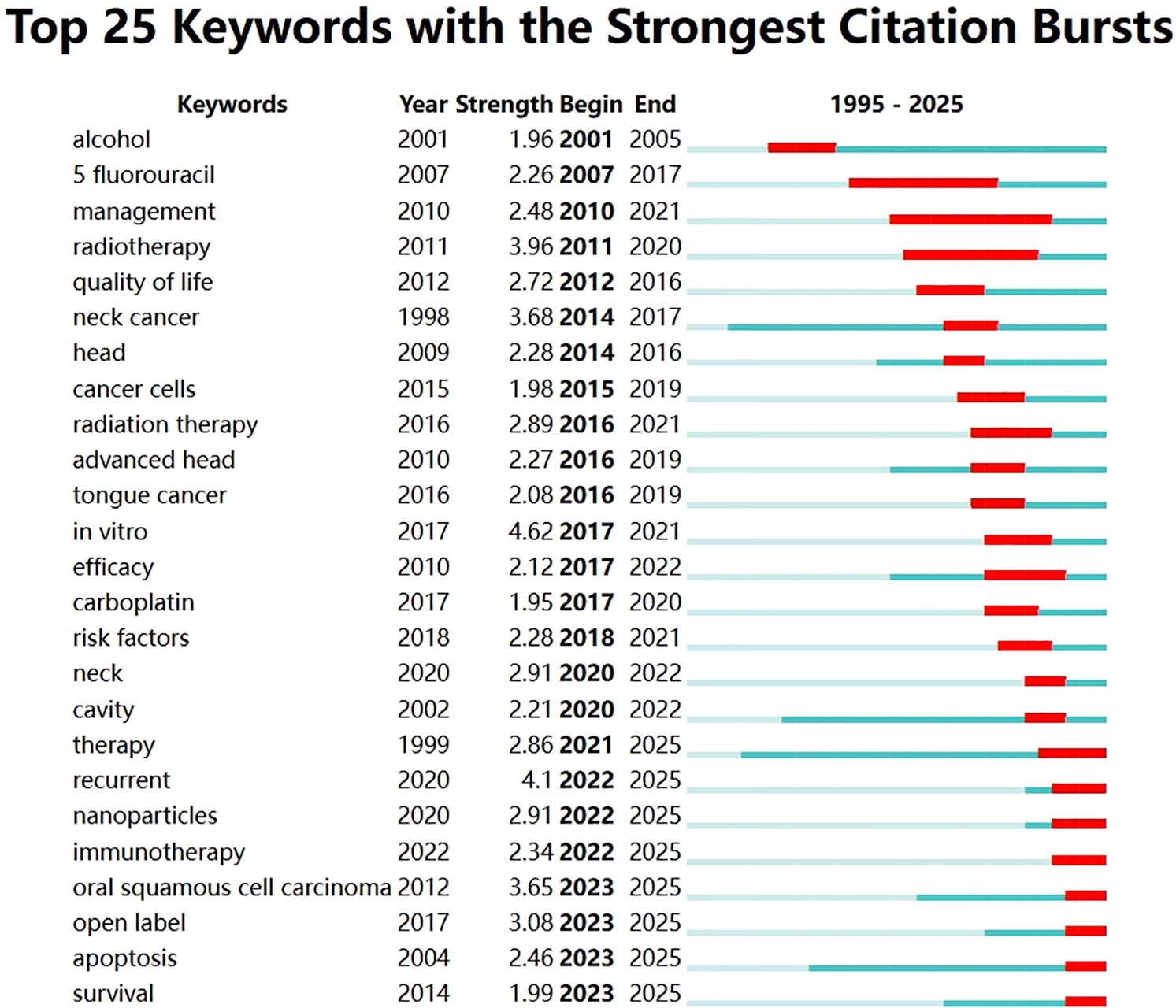 Fig. 9 presents the top 25 keywords with the strongest citation bursts in oral cancer drug adverse reactions research from 1995 to 2025. “In vitro” demonstrates the most intense burst strength (4.62) during 2017–2021, suggesting a significant surge in laboratory-based experimental research during this period. “Recurrent” exhibits the second strongest burst (4.10) beginning in 2022 and continuing through 2025, indicating growing recent attention to recurring disease and its management challenges. The visualization reveals distinct temporal patterns in research focus, with earlier bursts (2001–2005) centered on risk factors like “alcohol,” transitioning to treatment modalities such as “radiotherapy” (burst strength 3.96, 2011–2020) in the middle period, and evolving toward emerging therapeutic approaches including “nanoparticles” (burst strength 2.91) and “immunotherapy” (burst strength 2.34) in the most recent period (2022–2025). This chronological progression reflects the field’s evolution from basic risk factor identification toward increasingly sophisticated treatment approaches and their associated adverse reactions.
