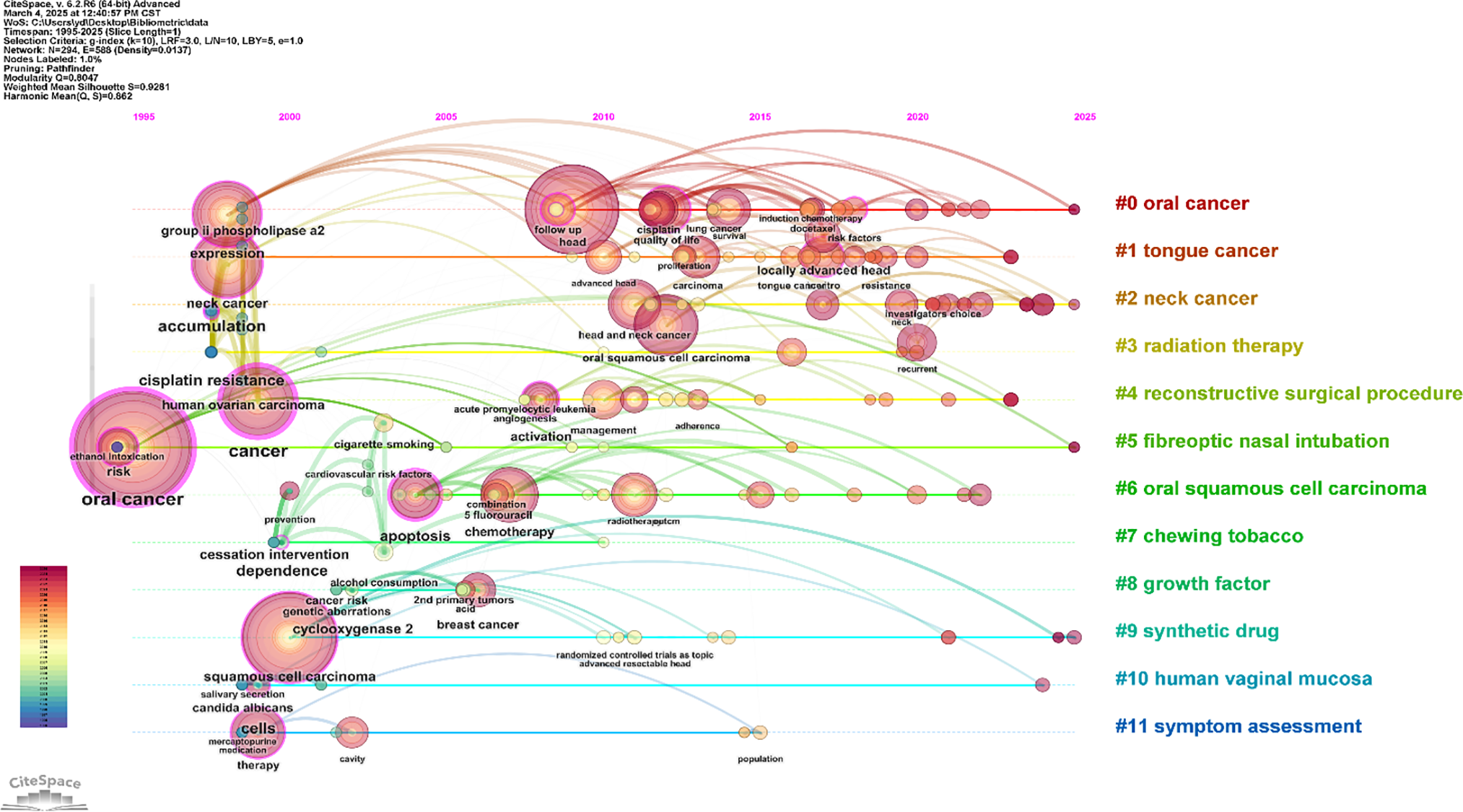 Fig. 8 illustrates the timeline visualization of keyword evolution in oral cancer drug adverse reactions research from 1995 to 2025, revealing distinct chronological patterns in research focus. The visualization demonstrates how foundational concepts like “oral cancer” and “cancer” emerged as earliest research priorities (1995–2000), establishing the conceptual framework for subsequent investigations. A clear progression is evident as research evolved from basic cancer biology toward treatment modalities, with “chemotherapy” and “apoptosis” gaining prominence during the middle period (2004–2010), followed by increased attention to specific therapeutic approaches such as “radiotherapy” and “immunotherapy” (2011–2017). The most recent research trends (2018–2025) show growing interest in advanced topics including “nanoparticles,” “recurrent” disease management, and precision medicine approaches, reflecting the field’s maturation toward more sophisticated treatment paradigms and their associated adverse effects management. This temporal mapping provides valuable insights into the historical development and future directions of research in oral cancer drug adverse reactions.