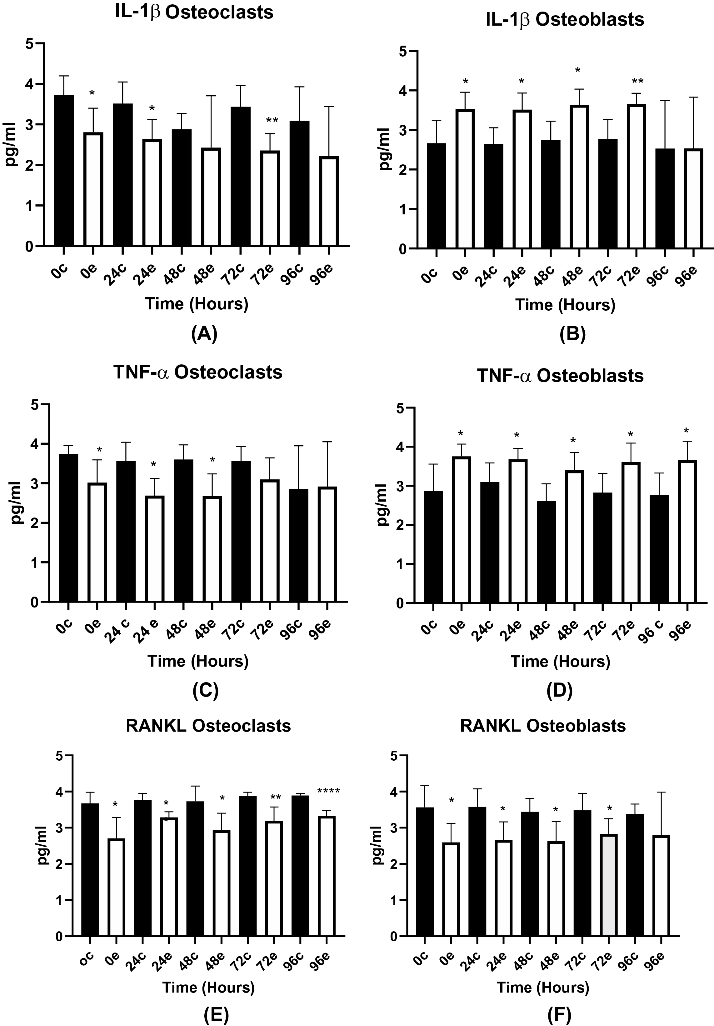 Fig. 2. IL-1β downregulated in osteoclasts (A) and upregulated in osteoblast (B); TNF-α downregulated in osteoclasts (C) and upregulated in osteoblasts (D); RANKL downregulated in osteoclasts (E) and osteoblasts (F).
