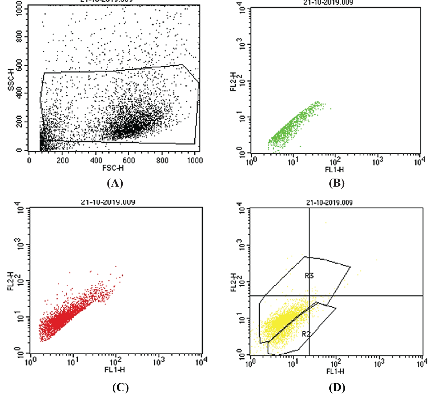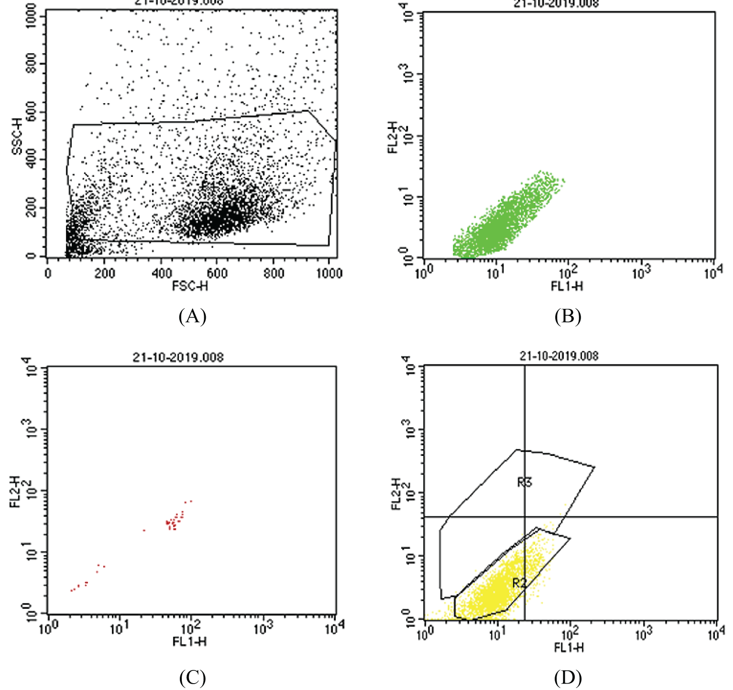 Fig. 4. Histogram 2. CatK production by bone marrow cells: Gate R1 (A) represents the cells analyzed, (B) Cells without anti-CatK antibody, (C) Cells positive for Catk in the microvibration group, and (D) Cells negative for CatK (R2) and positive for CAtK (R3).