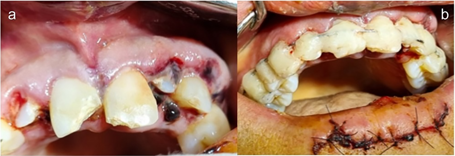 A 42-year-old female patient with maxillofacial trauma presented to our clinic as an outpatient, conscious, after an accidental 3-meter fall from the roof of her home. She had severely bleeding lacerations on the skin of her lower lip and multiple fractures of dental crowns.