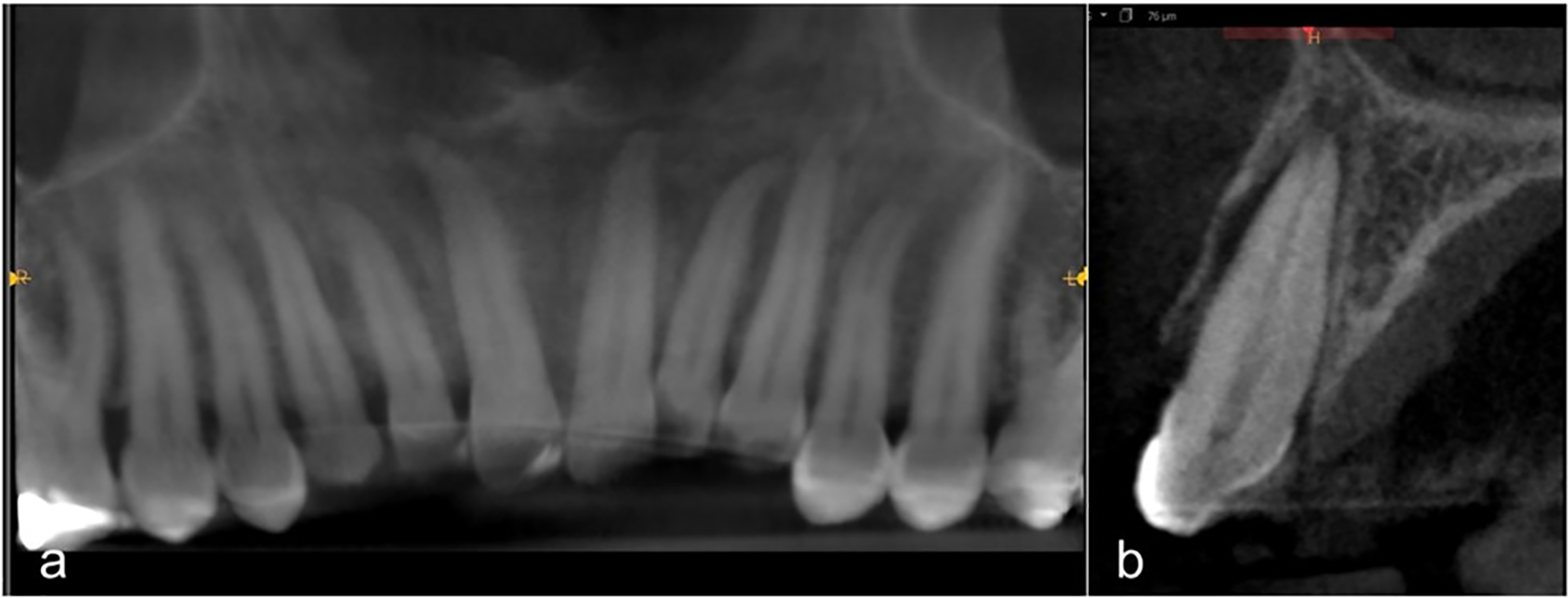 Fig. 8. Evolution of the right central incisor: a) sagittal CBCT at 48 hours, b) control at 16 months.