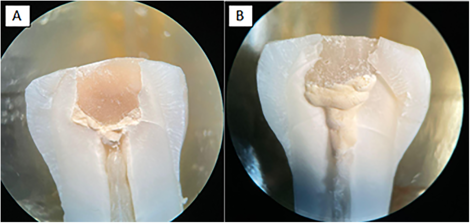 A representative sample was observed with the stereoscope, in both cases adhesive fractures were observed as depicted in Fig. 2. In group A, alkasite material presented an adhesive fracture, in which the material was completely separated leaving the tricalcium silicate cement exposed, in comparison to group B, which exhibited good dentine adhesion, even after the fracture.