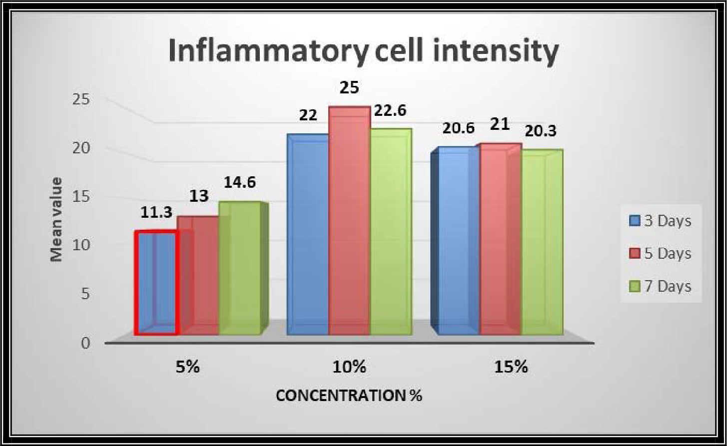 Fig 5. Mean values of inflammatory cell intensity among experimental sub-groups treated with various concentrations of rosemary cream.