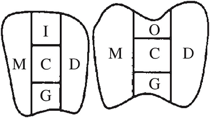 Plaque scores were assessed using the Personal Hygiene Performance Index (PHP) method with the aid of disclosing solution, a probe, and a mouth mirror. The examination was conducted on the facial or lingual surfaces of the tooth crowns, with each surface divided into five areas: D (distal), G (gingival third), M (mesial), C (middle third), and I/O (incisal or occlusal third) as shown in Fig. 1. This assessment involved six teeth: the labial surface of the upper right central incisor, the labial surface of the lower left central incisor, the buccal surface of the upper right first molar, the buccal surface of the upper left first molar, the lingual surface of the lower left first molar, and the lingual surface of the lower right first molar. The plaque score was calculated by dividing the total plaque scores of all examined surfaces by the number of teeth assessed. A score of 0 was given if no plaque was present, and a score of 1 was given if plaque was present. The PHP plaque score criteria are as follows: 0 = very good, 0,1–1, 7 = good, 1,8–3,4 = fair, and 3,5–5 = poor.